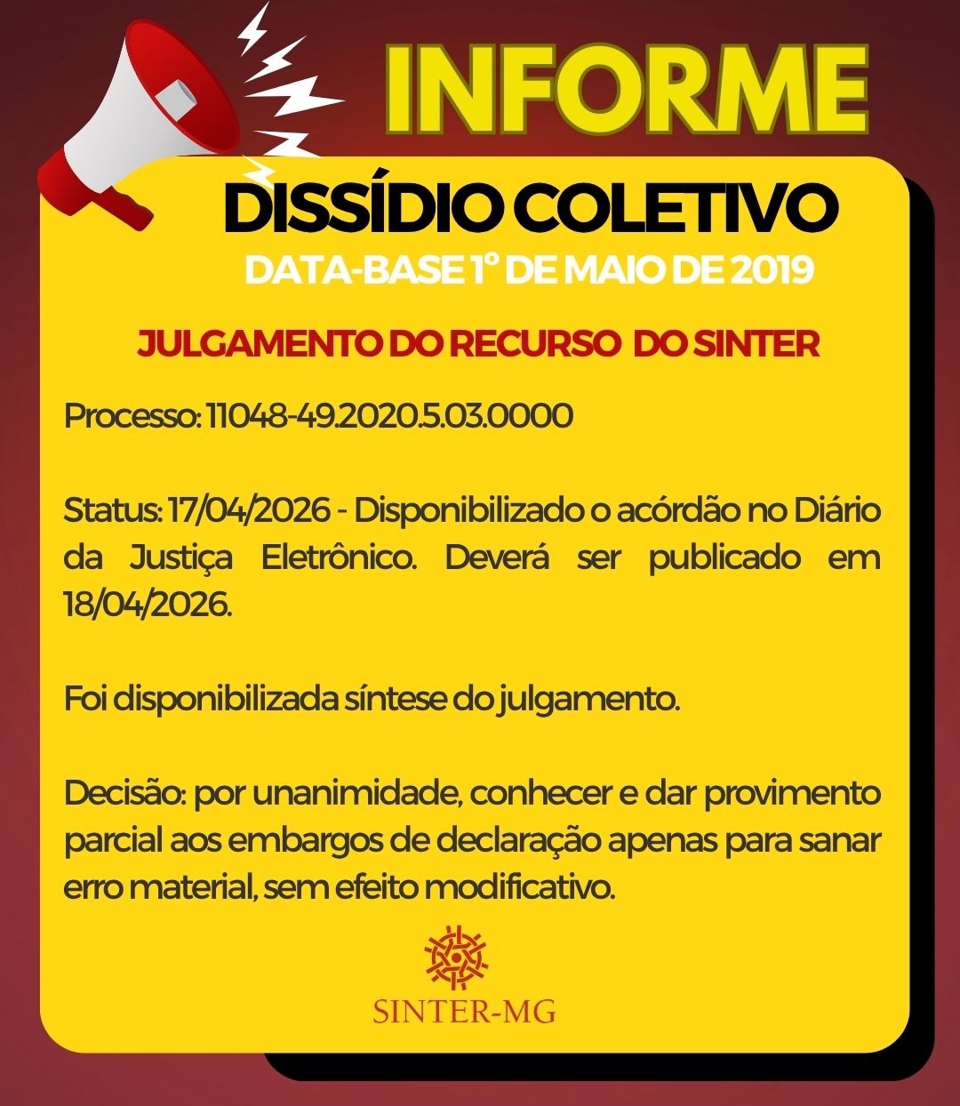 O SINTER, desde a sua fundação, em 28/4/1989, privilegia a negociação coletiva, com vista a resolver as questões relacionadas aos interesses individuais homogêneos de seus sócios. A judicialização só se dá, quando esgotadas as possibilidades de solução, diretamente entre as partes.