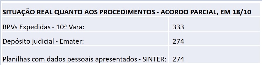 O SINTER verificou com servidores da 10ª Vara, a possibilidade de antecipar a apresentação dos dados pessoais, antecedendo à expedição das RPVs. Entretanto, tais dados terão de continuar sendo enviados para se expedir os alvarás, uma vez que o pagamento em conta judicial específica deve preceder, pois estes dados estarão vinculados à conta de depósito.