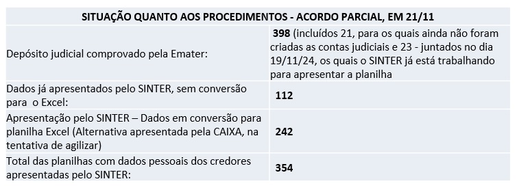 A CAIXA apresentou uma alternativa que poderá agilizar, para que o SINTER reapresente as planilhas em “Excel”. A intimação do ofício com tal proposição foi publicada no dia 18/11/24.