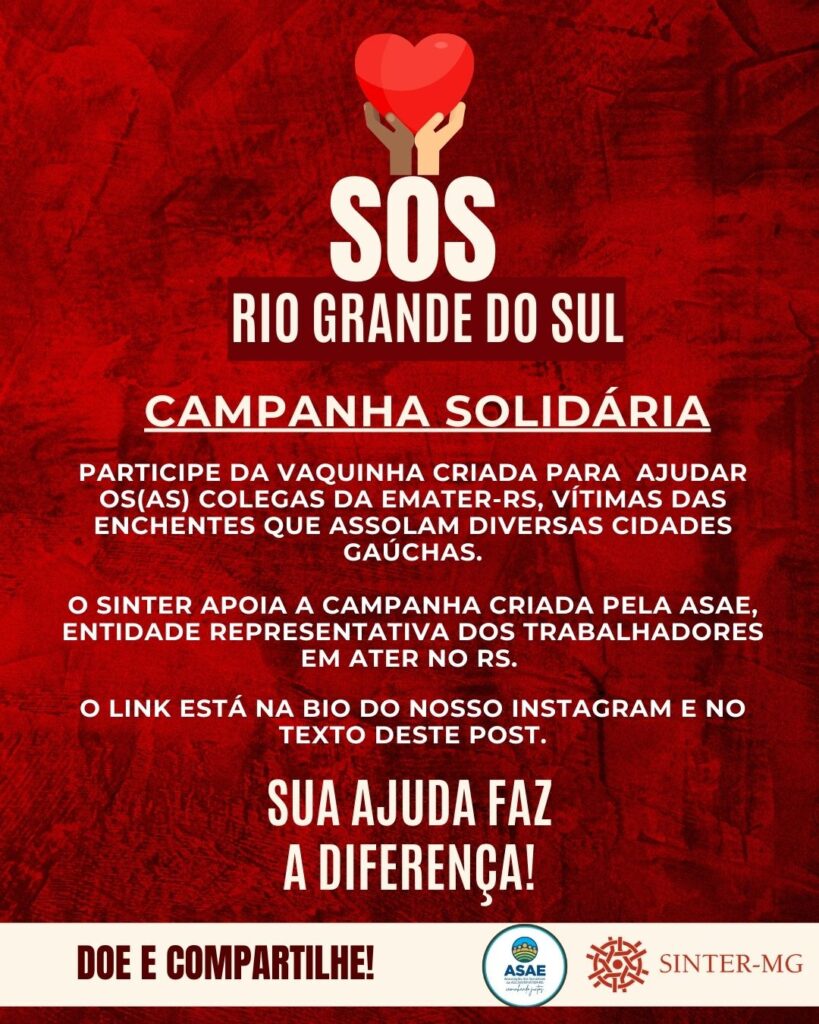 A Asae, entidade representativa dos trabalhadores da ATER no Rio Grande do Sul, criou uma campanha para ajudar as pessoas que estão sofrendo com as chuvas no Rio Grande do Sul, especialmente os(as) colegas da Emater, vítimas das enchentes que assolam diversas cidades gaúchas.
