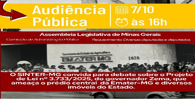 O Sinter convida trabalhadores, agricultores e suas entidades representativas para audiência pública que irá debater o projeto de Lei que inclui diversos imóveis como parte do pagamento da dívida do Estado, no Propag.