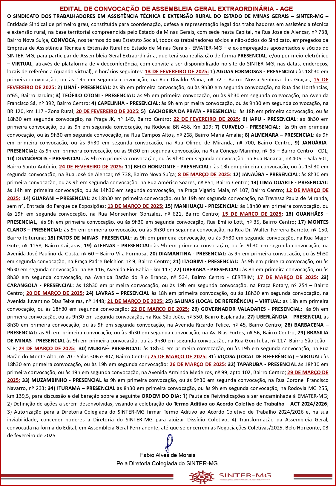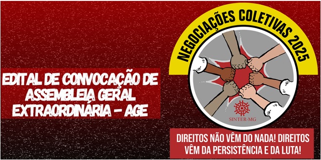 A diretoria colegiada do SINTER-MG convoca todos os trabalhadores e trabalhadoras – sócios(as) e não sócios(as), empregados(as) da Empresa de Assistência Técnica e Extensão Rural do Estado de Minas Gerais – EMATER-MG, ex-empregados(as), aposentados(as) e sócios(as) do SINTER-MG, para a Assembleia Geral da categoria, com o objetivo de definir a pauta de reivindicações visando firmar Termo Aditivo ao Acordo de Trabalho – ACT 2024/2026.