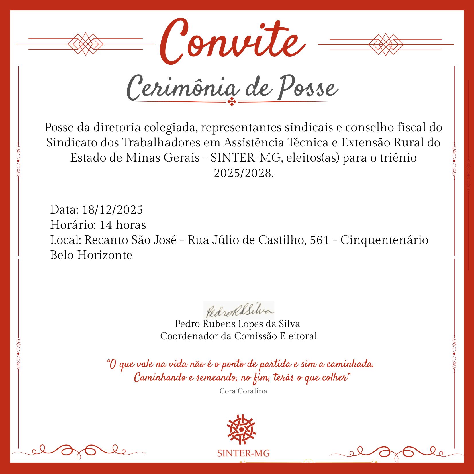 Companheiro(a), sócio(a) do Sinter. Você é nosso(a) convidado(a) para a cerimônia de posse da diretoria colegiada, representantes sindicais e conselho fiscal do SINTER-MG, eleitos(as) para o triênio 2025/2028.