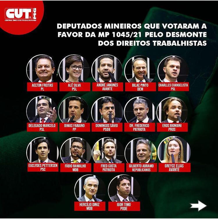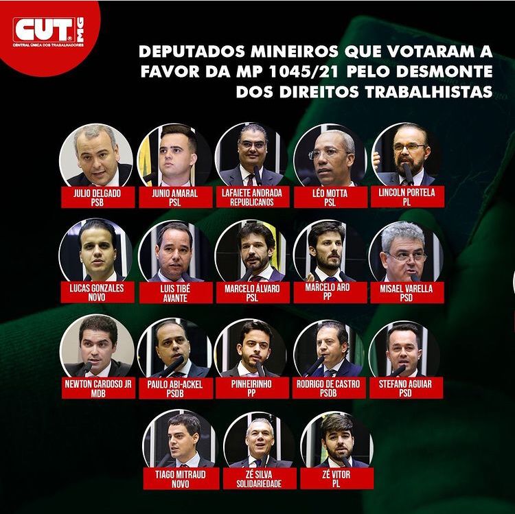 Guarde esses nomes e se lembre deles na próxima eleição. Estes são os deputados federais eleitos por Minas Gerais, que votaram a favor da MP 1045, a nova Reforma Trabalhista de Bolsonaro, que legaliza contratos sem carteira assinada, 13º, férias, salário mínimo, previdência, diminui valor de horas extras e FGTS, entre outras perdas de direitos. O texto foi aprovado na Câmara e, se aprovado no Senado, o trabalhador poderá ganhar menos de um salário mínimo por mês, ter bolsa ao invés de salário e, ainda, ficar sem aposentadoria e auxílio-doença. Recorrer à Justiça para cobrar direitos também vai ficar impossível. É retrocesso, atrás de retrocesso. E a conta mais uma vez fica para o trabalhador! Pressione os senadores mineiros a votar contra mais esse ataque. #naoamp1045