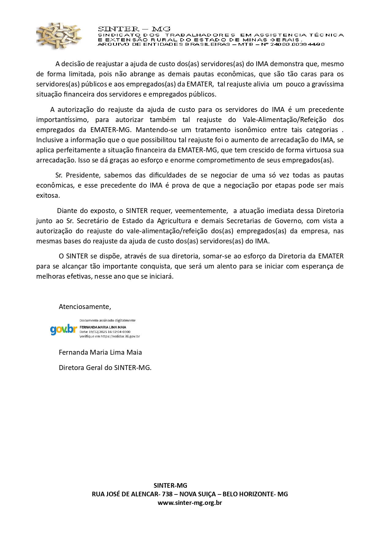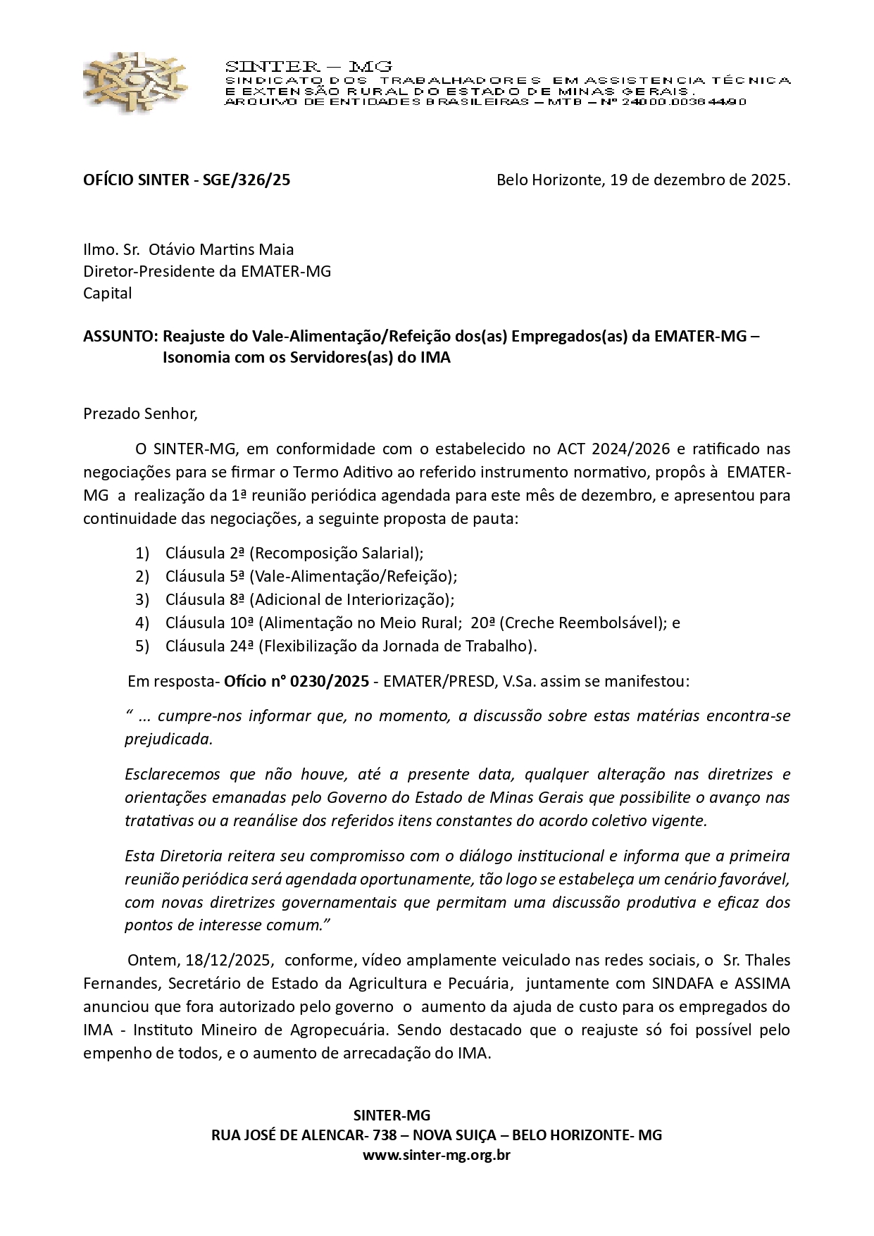 O SINTER-MG encaminhou à diretoria da Emater-MG, na tarde desta sexta-feira, 19/12, ofício sobre o reajuste do vale-alimentação/refeição. Confira: