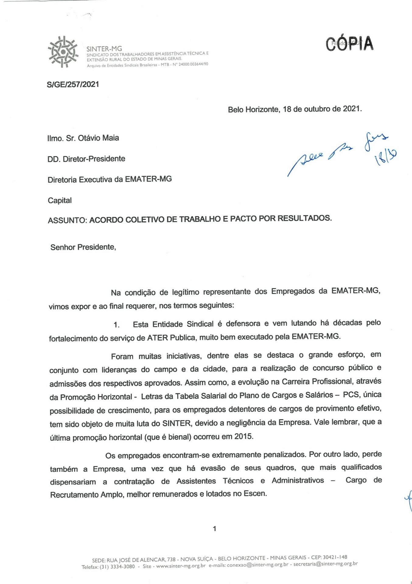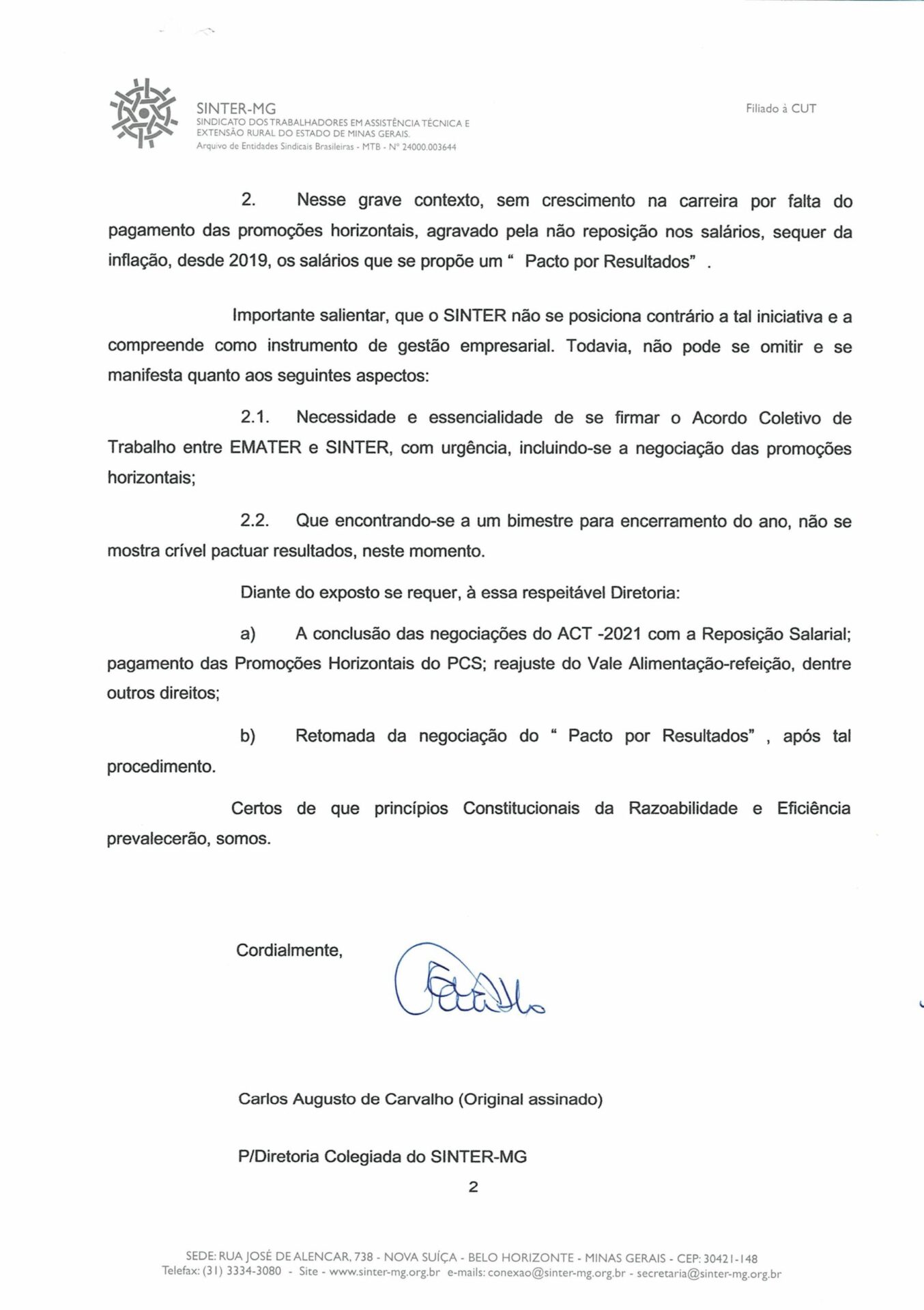 O SINTER-MG solicitou à diretoria da Emater-MG, o adiamento do “pacto por resultados”, devido à proximidade do final do ano e à falta de conclusão das negociações coletivas 2021, com pagamento das Promoções Horizontais do PCS; reajuste do Vale Alimentação-refeição, dentre outros direitos.