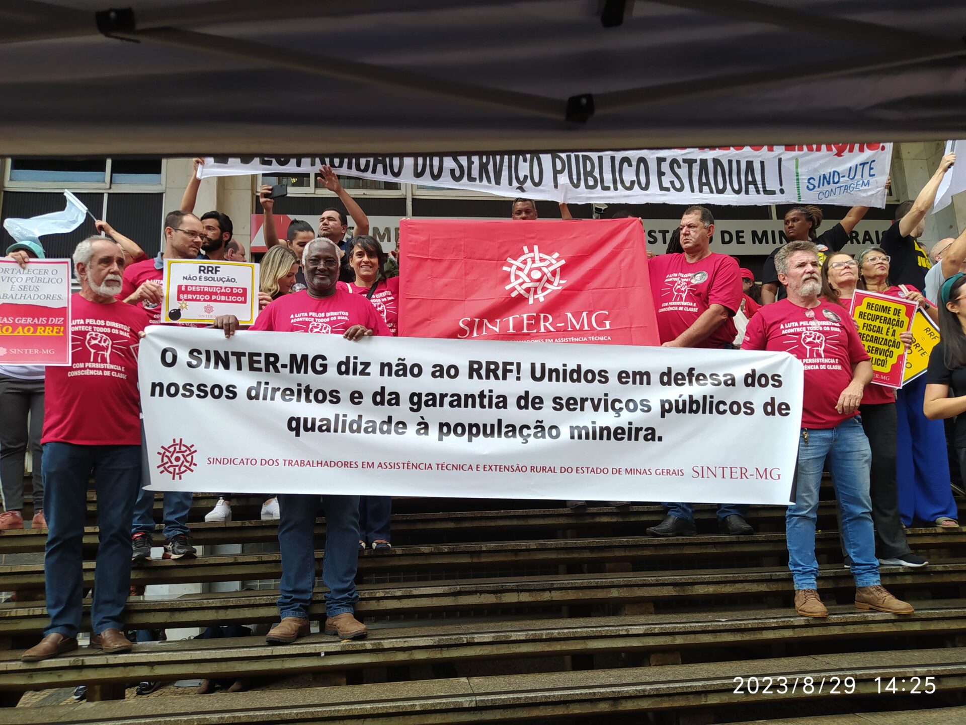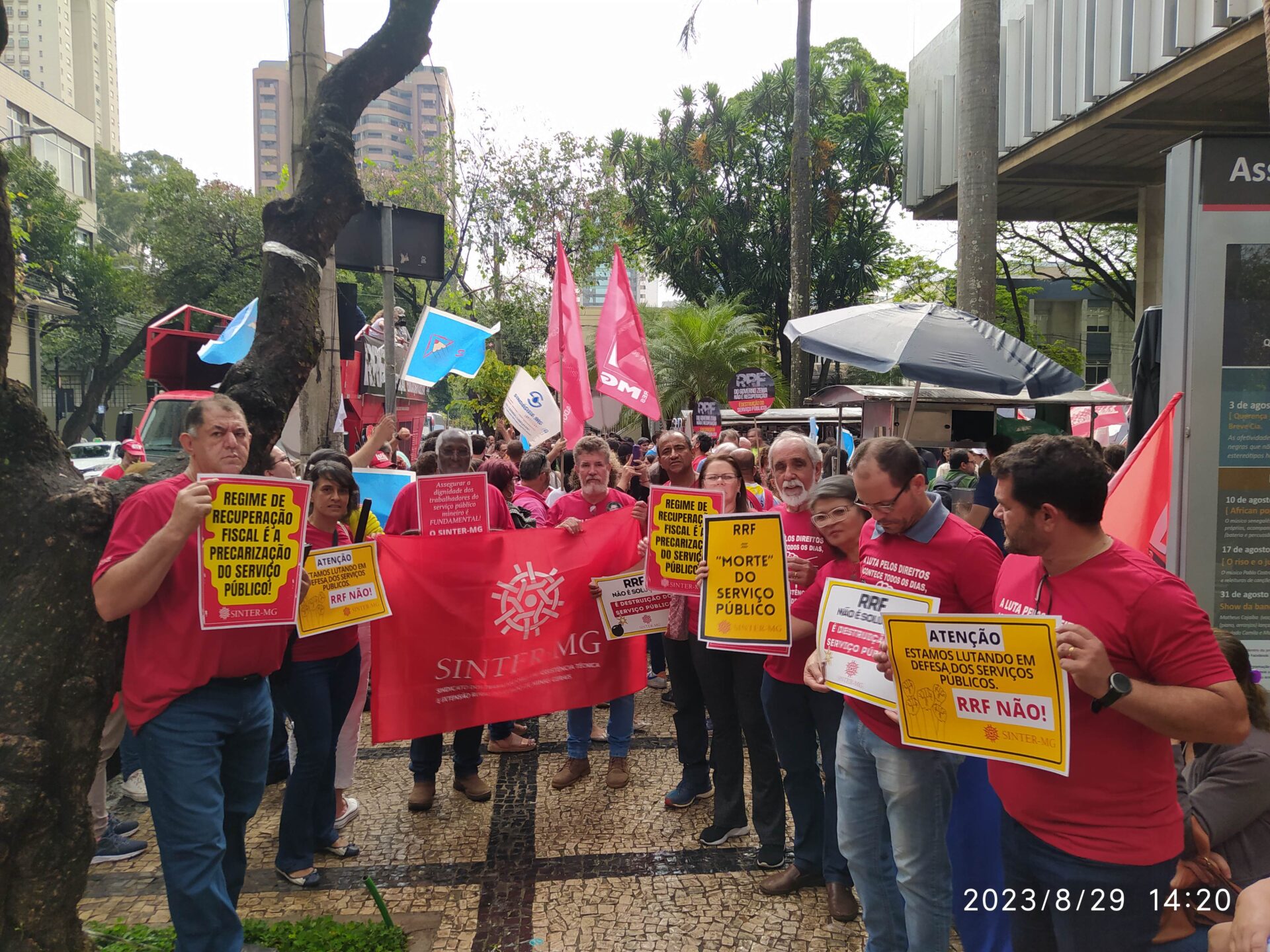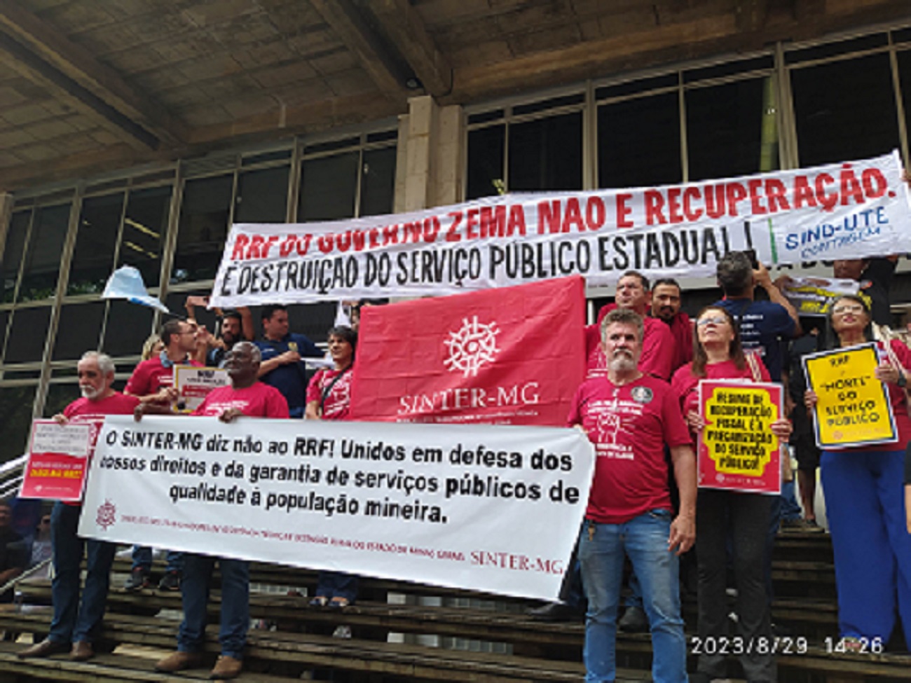 Na última terça-feira, 29/8, trabalhadoras e trabalhadores de diversas categorias do serviço público e movimentos sociais foram às ruas lutar em defesa do serviço público. O movimento da Frente Mineira em Defesa do Serviço Público, da qual o SINTER-MG faz parte, manifestou contra a proposta do governo do Estado de adesão ao Regime de Recuperação Fiscal (RRF).
