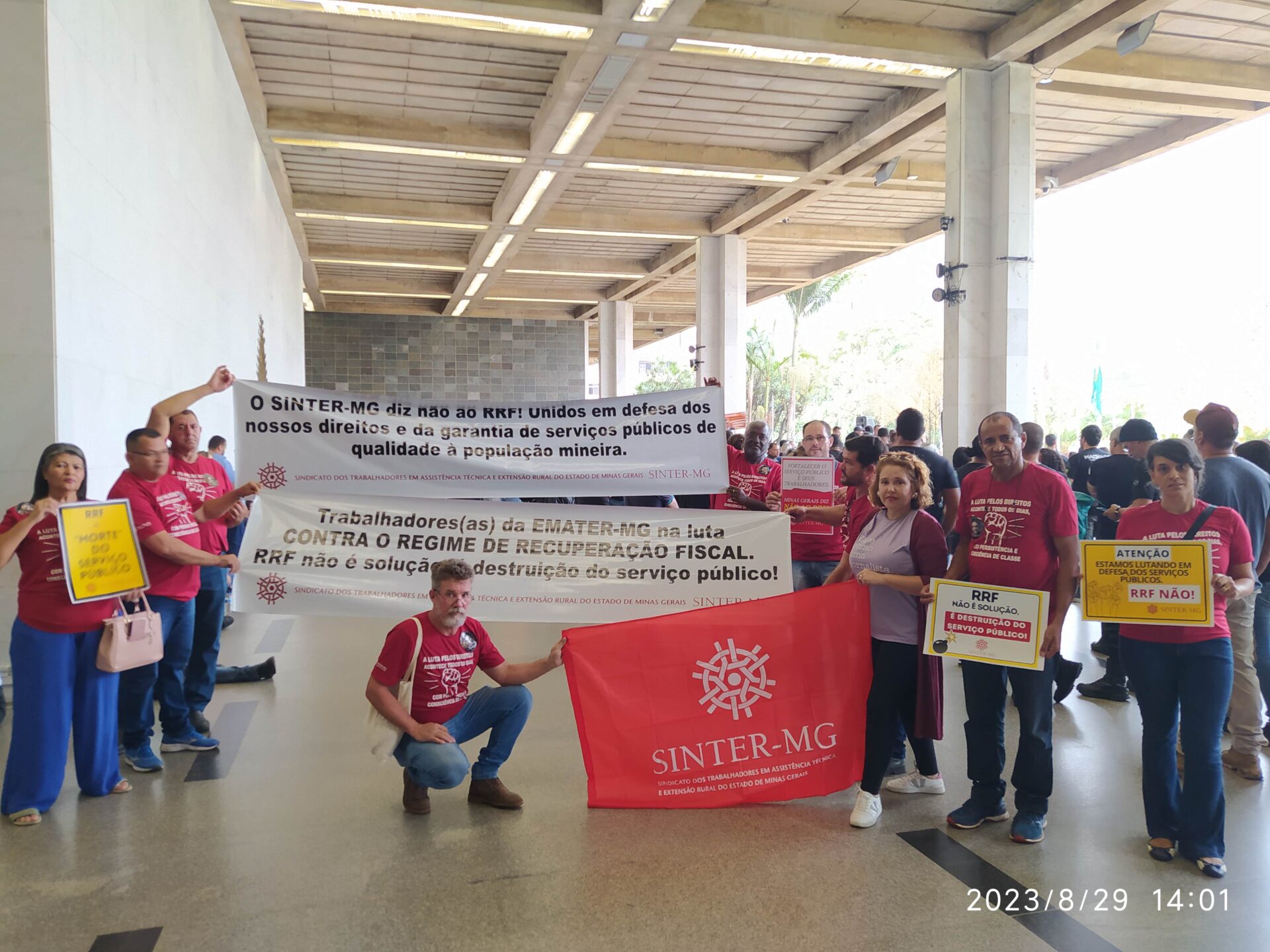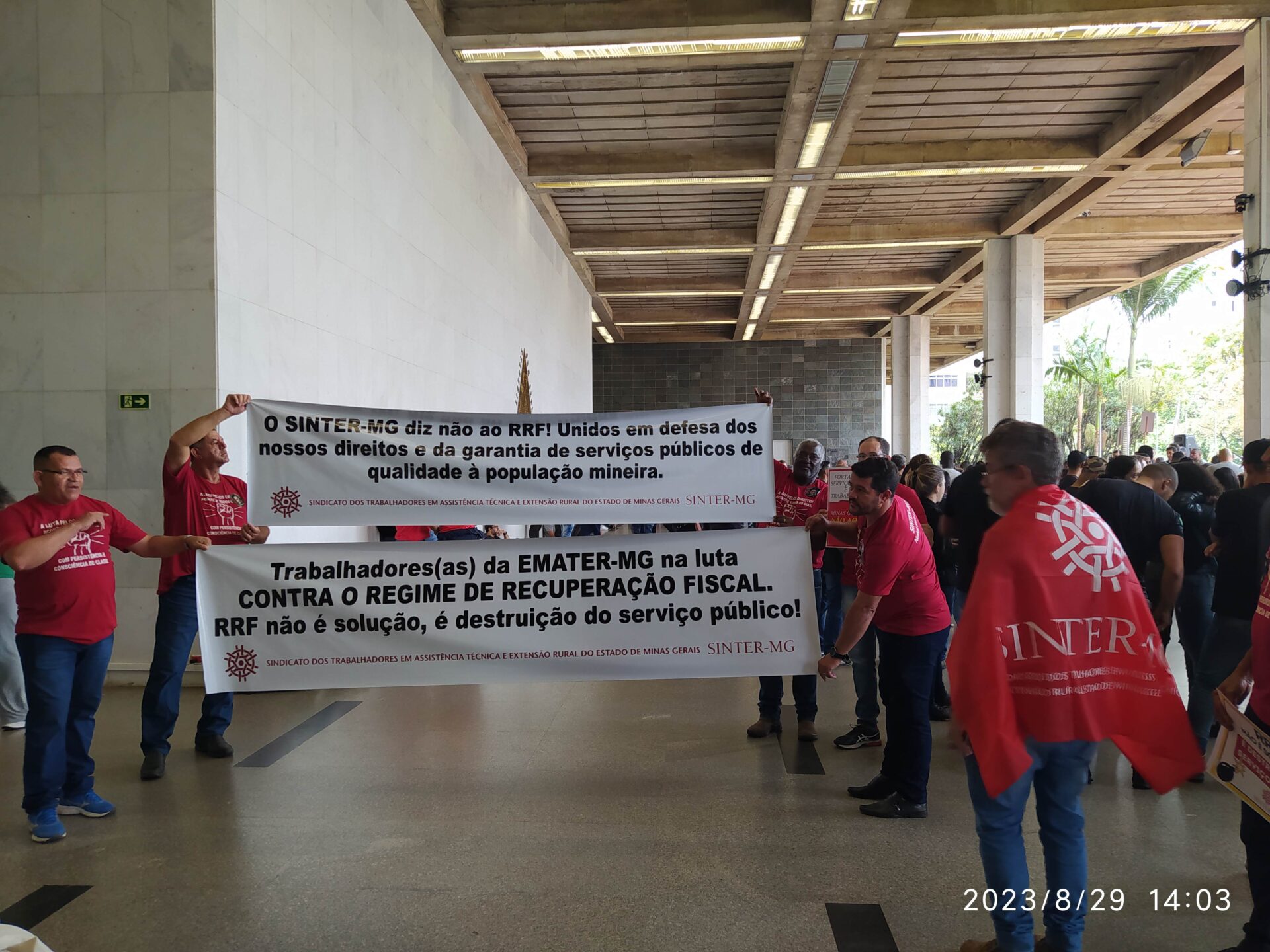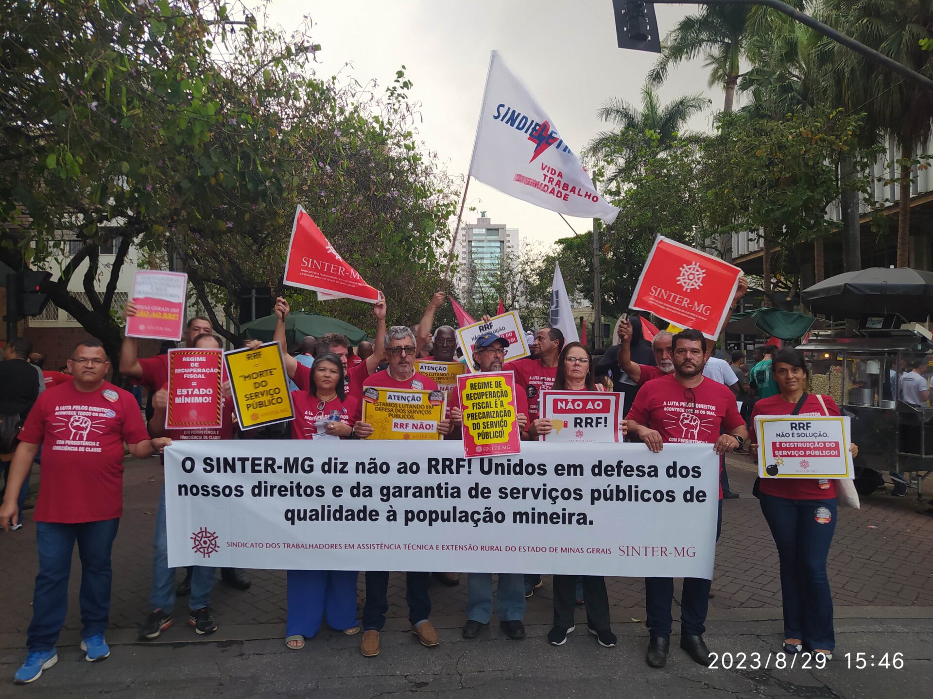 Na última terça-feira, 29/8, trabalhadoras e trabalhadores de diversas categorias do serviço público e movimentos sociais foram às ruas lutar em defesa do serviço público. O movimento da Frente Mineira em Defesa do Serviço Público, da qual o SINTER-MG faz parte, manifestou contra a proposta do governo do Estado de adesão ao Regime de Recuperação Fiscal (RRF).